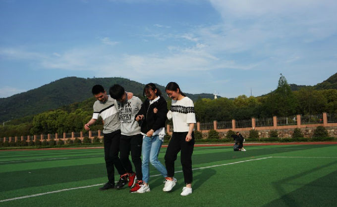 当四个人的脚被绑在了一起,他们的行动变得困难了。有些小组的四个人因为相互间的不协调,而东倒西歪。而有些小组之间可谓是相当的默契,四个人喊着“1,2,1”,快速的走到了终点。