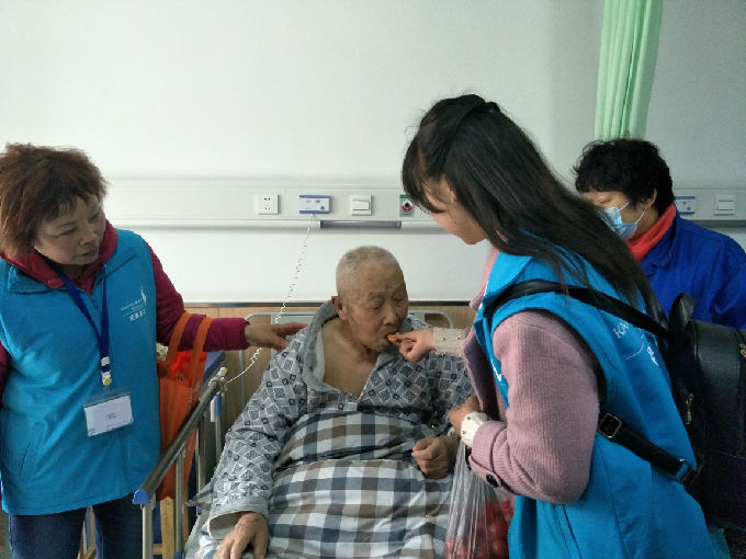 还有一位退伍军人的爷爷,护士带学生进去时,一脸调皮可爱的表情,性格很开朗,虽然已经94岁的高龄,但是这位爷爷看到我院学生,仍然倔强地坐起来和学生们聊天,很自然地拉着他们的手,就像是多年不见的老友,并且告诉了我们的学生要好好学习,为学生竖起了大拇指。这些老人很令人敬佩,他们中有退伍的军人、退休的老师,他们生活的很幸福,很安定。学生也因能来探望他们而感到荣幸。学生们有幸见了一位江南大学的老教授,也是94岁的高龄,但她却不像其他老人躺在床上,她拥有一间自己的房间,那是一间练字房,她也送给了我院学生一些她自己写的毛笔字。这次活动中,遇到年龄最大的老人是位104岁的奶奶,身体硬朗,笑容灿烂地和学生们在一起合照。