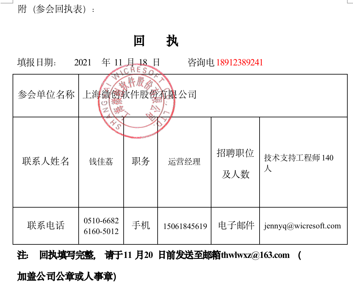 2、邮箱地址: thwlwxz@163.com (参会的单位请先将回执、营业执照、招聘简章 发送到邮箱, 招聘单位信息收集要求及回执请往下见附页)