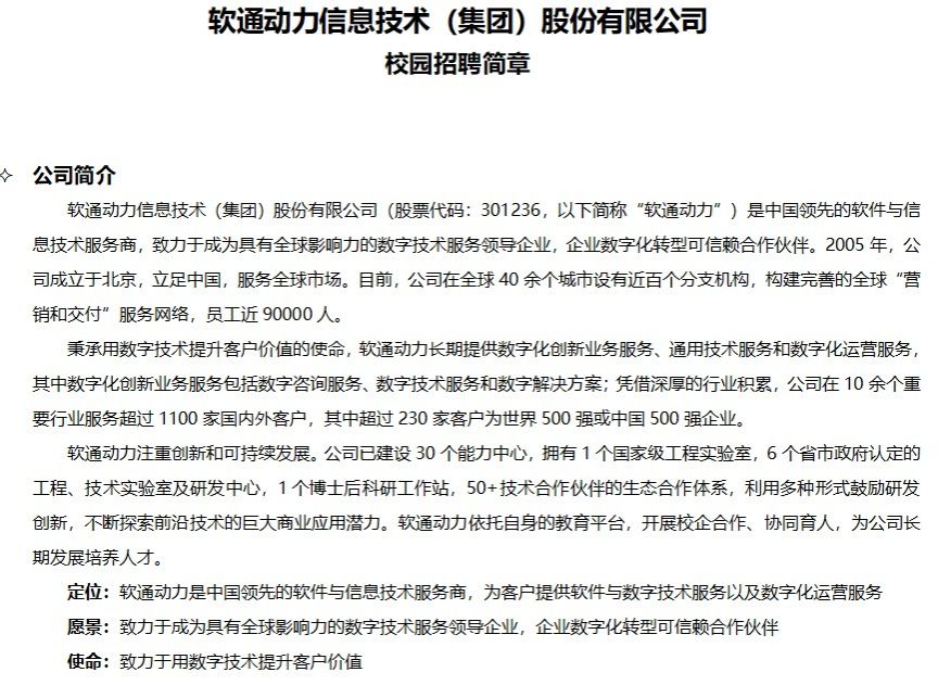 软通动力信息技术(集团)股份有限公司(股票代码:301236,以下简称“软通动力”)是中国领先的软件与信息技术服务商,致力于成为具有全球影响力的数字技术服务领导企业,企业数字化转型可信赖合作伙伴。2005年,公司成立于北京,立足中国,服务全球市场。目前,公司在全球40余个城市设有近百个分支机构,构建完善的全球“营销和交付”服务网络,员工近90000人。