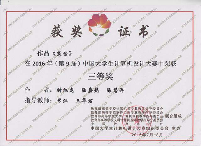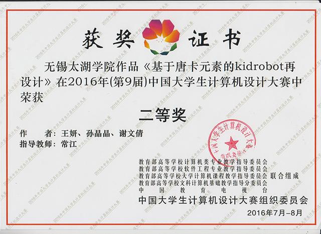 参加2016年(第9届)中国大学生计算机设计大赛的选手中,有6名同学来自我校物联网学院。他们是:孙晶晶、王妍与谢文倩一组,设计的作品是“基于唐卡元素的kidrobot再设计”;时旭龙、陆嘉懿、陈骛洋一组,设计的作品是微电影《葱匆》,在首战中国大学生计算机设计大赛江苏省决赛中,分别获江苏省赛三等奖。接着,在迎战中国大学生计算机设计大赛国家总决赛时,两组同学在常江、王华君老师的悉心指导下,不负众望,分别夺得全国二等奖和三等奖。