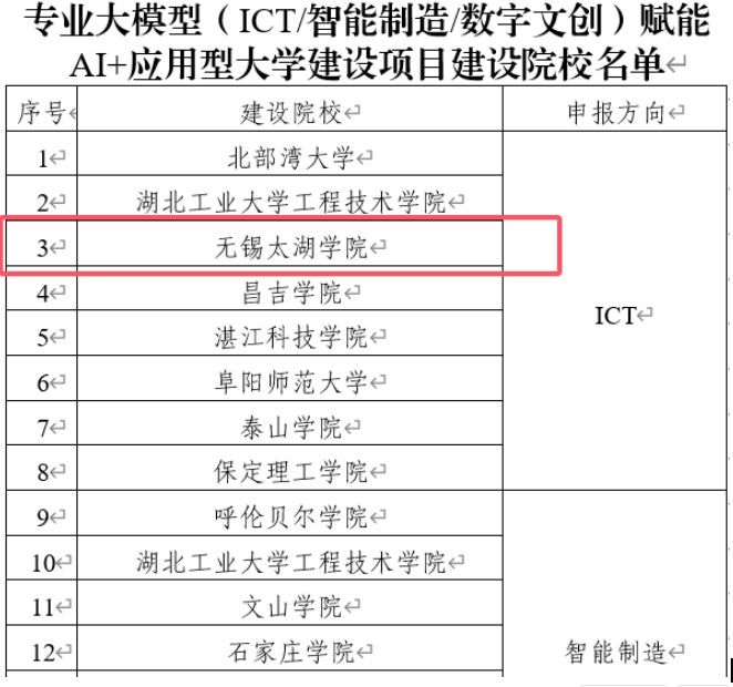 近日,教育部学校规划建设发展中心正式公布《专业大模型(ICT/智能制造/数字文创)赋能AI+应用型大学建设项目建设院校名单》,无锡太湖学院凭借在应用型人才培养与学科数字化建设的扎实积淀,从全国众多高校中脱颖而出,成功入选!