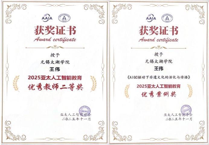 在11月22日晚举办的“2025亚太人工智能教育颁奖盛典”上,我院王伟老师凭借在人工智能教育领域的持续投入与扎实成效,荣获“2025亚太人工智能教育优秀教师奖”和“2025亚太人工智能教育优秀案例奖”两项重要奖项。未来,我院将持续深化人工智能与教育创新的融合发展,加快建设高水平人工智能人才培养体系,为推动人工智能教育高质量发展持续贡献智慧与力量。