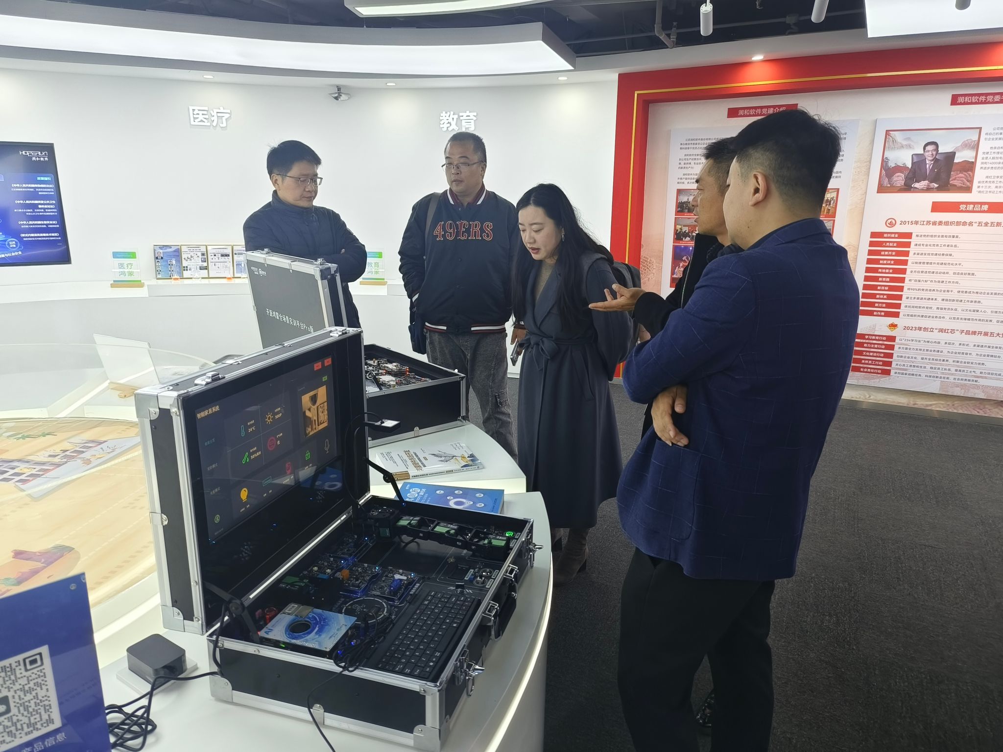 在润和软件无锡分公司负责人孙虎的陪同下,学院领导一行深入企业研发中心与项目展厅,实地观摩了企业在鸿蒙生态、人工智能、边缘计算、智慧物联等前沿领域的技术成果与应用场景展示。企业方详细介绍了其在新一代信息技术,尤其是在开源鸿蒙技术路线下的创新实践、行业解决方案及未来战略布局,展现了深厚的技术积淀与旺盛的市场活力。