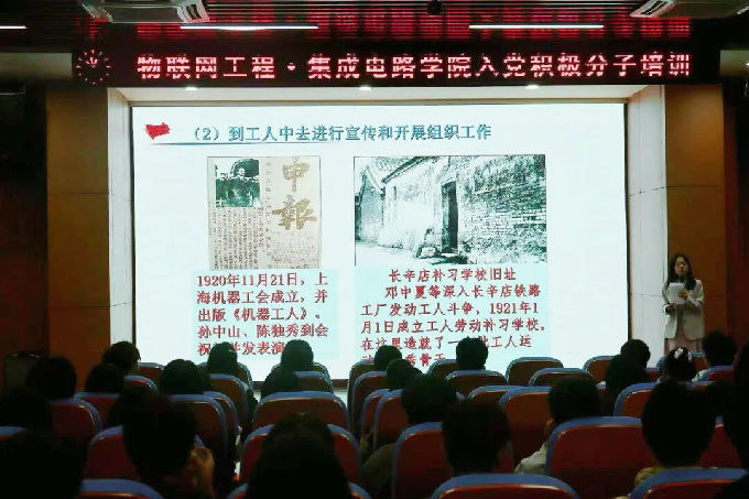 物联网工程学院党总支副书记沈峰,学生第一支部书记宋瑞敏、学生第二支部书记王佩、学生第三支部书记丁苗,马克思主义学院潘杰老师以及全体入党积极分子学员参加仪式。