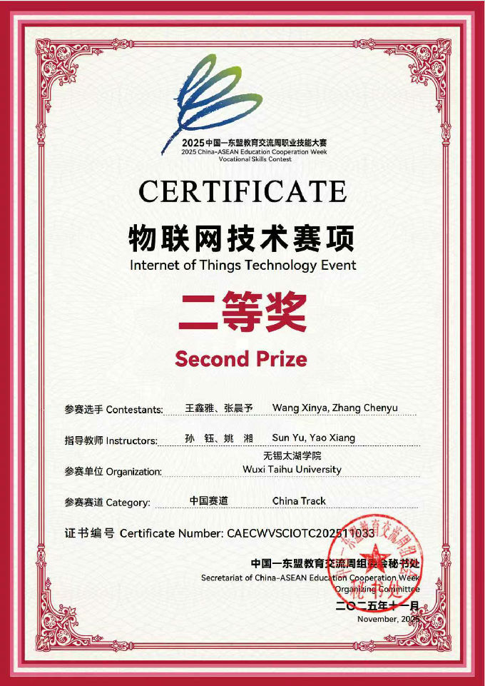 2025 中国 — 东盟教育交流周职业技能大赛物联网技术赛项于 11 月 22 日在南通职业大学成功举办。本次赛事以 “技炫青春、能创未来” 为主题,吸引了中国及菲律宾、印尼、新加坡等东盟国家的 100 支队伍、200 名选手同台竞技,搭建起跨国界、跨年级的技术交流与人才共育平台。其中,由沈峰书记,孙钰老师带队参加比赛的物联网2401王鑫雅,通信2301张晨予小队斩获二等奖。