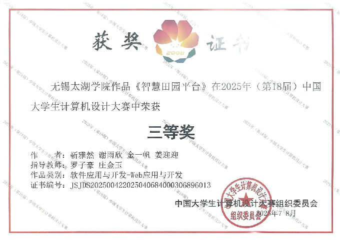 近日,2025年(第18届)中国大学生计算机设计大赛全国总决赛在山东省泰安市泰山学院圆满落幕。由我校物联网工程学院罗子豪、庄金玉老师指导,靳雅然、谢雨欣、金一帆、姜迎迎四位同学的参赛作品《智慧田园平台》在此次国赛中表现出色,经过激烈角逐,最终荣获国家级三等奖。