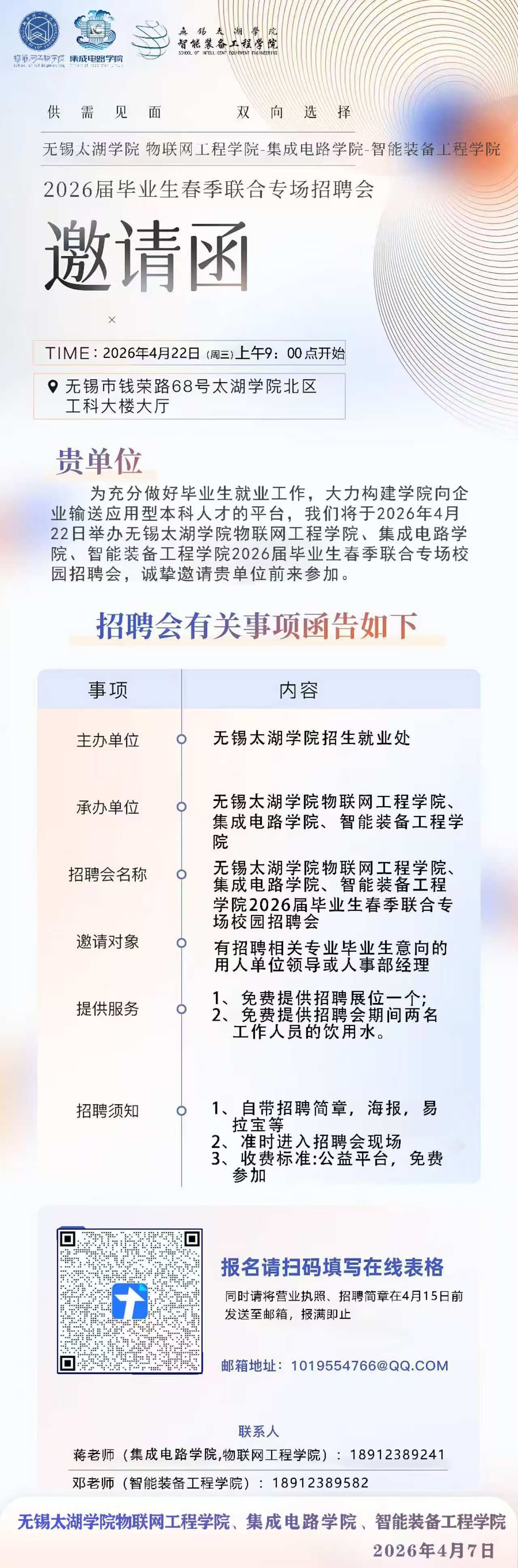 为充分做好毕业生就业工作,大力构建学院向企业输送应用型本科人才的平台,无锡太湖学院物联网工程学院、集成电路学院、智能装备工程学院将于2026年4月22日举办2026届毕业生春季联合专场校园招聘会,诚挚邀请贵单位前来参加。