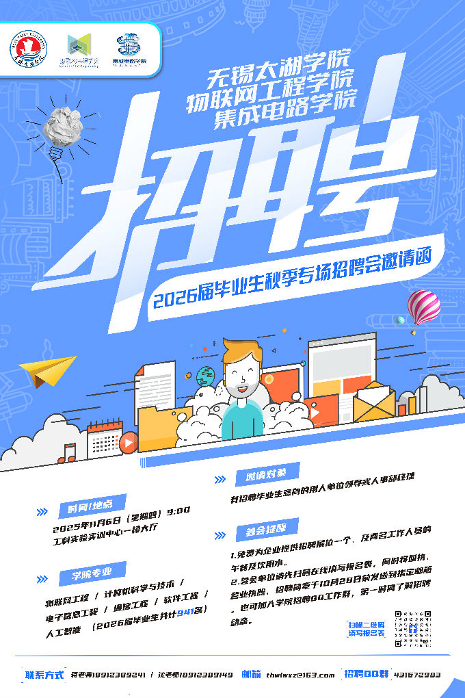 为充分做好我院毕业生就业工作,大力构建学校向用人单位输送应用型本科人才的平台,无锡太湖学院物联网工程学院、集成电路学院将于2025年11月6日举办2026届毕业生专场招聘会,诚挚邀请贵单位前来参加。